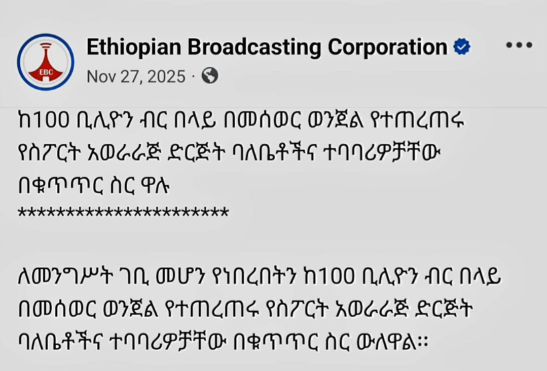 ከቤቲንግ ጋር በተያያዘ ከ100 ቢሊዮን ብር በላይ በመሰወር ወንጀል ተጠርጥረው ታስረው የነበሩ 24 ግለሰቦች ሙሉ በሙሉ ከእስር መለቀዋቸው ታወቀ Meseret MediaJan 29, 2026∙ Paid4Share(መሠረት ሚድያ)- "ለመንግሥት ገቢ መሆን የነበረበትን ከ100 ቢሊዮን ብር በላይ በመሰወር ወንጀል የተጠረጠሩ የስፖርት አወራራጅ ድርጅት ባለቤቶችና ተባባሪዎቻቸው በቁጥጥር ስር ዋሉ" የሚል ዜና በመንግስት ሚድያዎች በሰበር ዜና መልክ ጭምር የተሰማው የዛሬ ሁለት ወር ገደማ ህዳር 18/2018 ዓ.ም ነበር። በነዚህ …Continue reading this post for free, courtesy of Meseret Media.Claim my free postOr purchase a paid subscription.PreviousNext