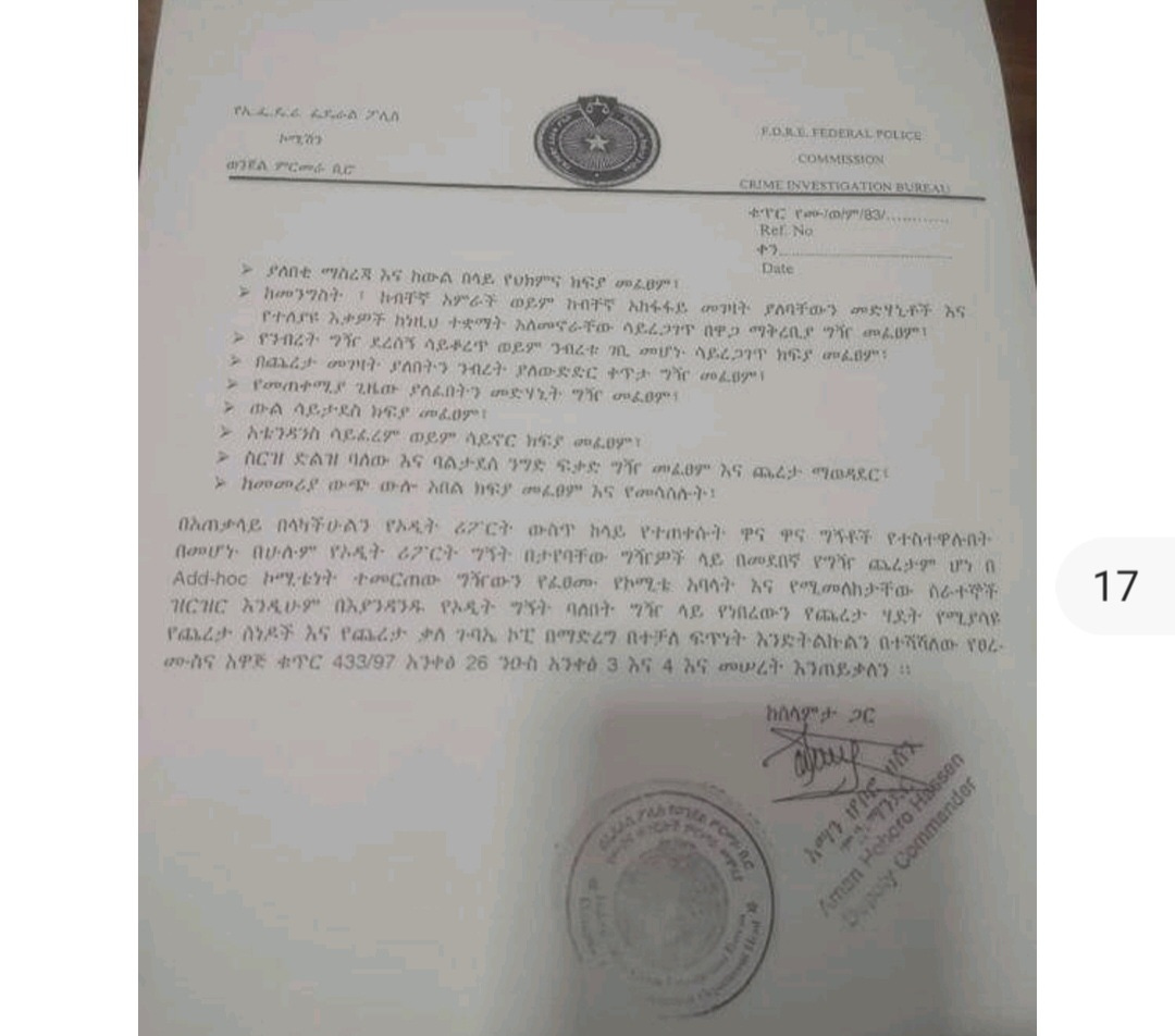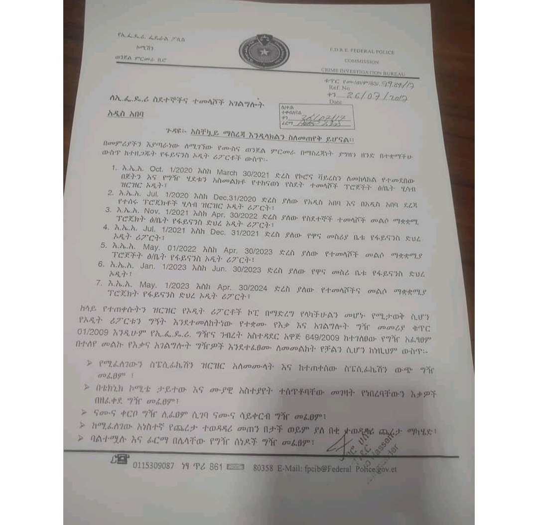 የፌደራል ወንጀል ምርመራ የቀረበለትን የምርመራ ጥያቄ በማጠናከር ምርመራዉን ለመጀመር ለፍትህ ሚኒስትር ጥያቄ በማቅረብ የምርመራ ስራዉን የጀመረ ሲሆን በምርመራ ወቅት የፌደራል ፖሊስ ያከናወናቸዉ ሥራዎች የዉስጥ ኦዲት ሪፖርትን መነሻ በማድረግ በኦዲት ስራዉ የተሳተፉ የኦዲት ሪፖርቱ ትክክለኛ መሆኑን ማረጋገጫ አግኝቷል።