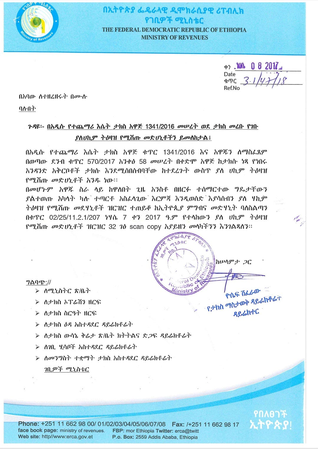 "አዋጁ ስራ ላይ ከዋለበት ግዜ አንስቶ በዘርፉ ተሰማርተው ግዴታቸውን ያልተወጡ አካላት ካሉ ተጣርቶ አስፈላጊው እርምጃ እንዲወሰድ እናሳስባለን" በደብዳቤው ያለው የገቢዎች ሚኒስቴር ያለ ሀኪም ትዕዛዝ የሚሸጡ መድሀኒቶች ዝርዝር ከኢትዮጵያ ምግብ እና መድሀኒት ቁጥጥር ባለስልጣን እንደደረሰው ያስረዳል።