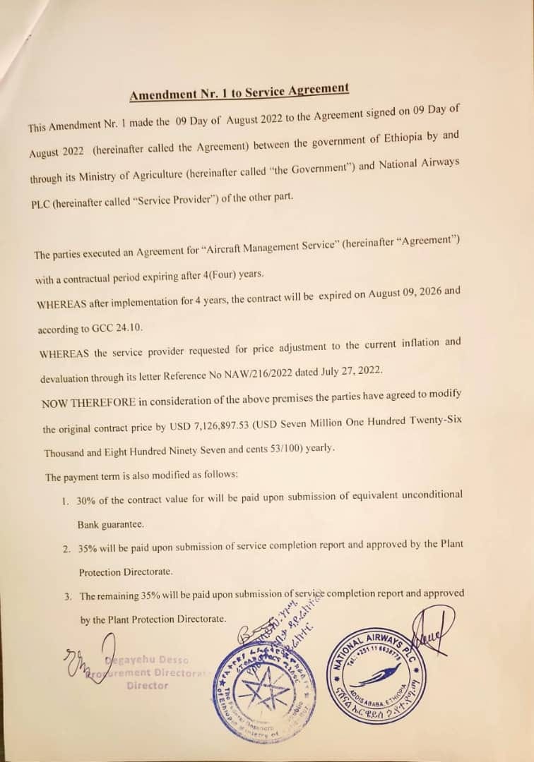 "ናሽናል ኤርዌይስ በኬሚካል ርጭት ልምድ ባይኖረውም ተመረጠ፣ ከዚህ በበለጠ የሚገርመው ግን አንደኛው አመት ከተጠናቀቀ በኋላ ውሉን ለማስረዘም በታሰረ ሌላ ውል በአመት ለድርጅቱ የሚከፈለው የገንዘብ መጠን በአመት 7,126,897 ዶላር (ሰባት ሚሊዮን አንድ መቶ ሀያ ስድስት ሺህ ስምንት መቶ ዘጠና ሰባት ዶላር) መሆኑ ነው" የሚሉት ባለሙያው ይህ የግብርና ሚኒስቴር ሰራተኞች በሙሉ ማስገረሙን ያነሳሉ።