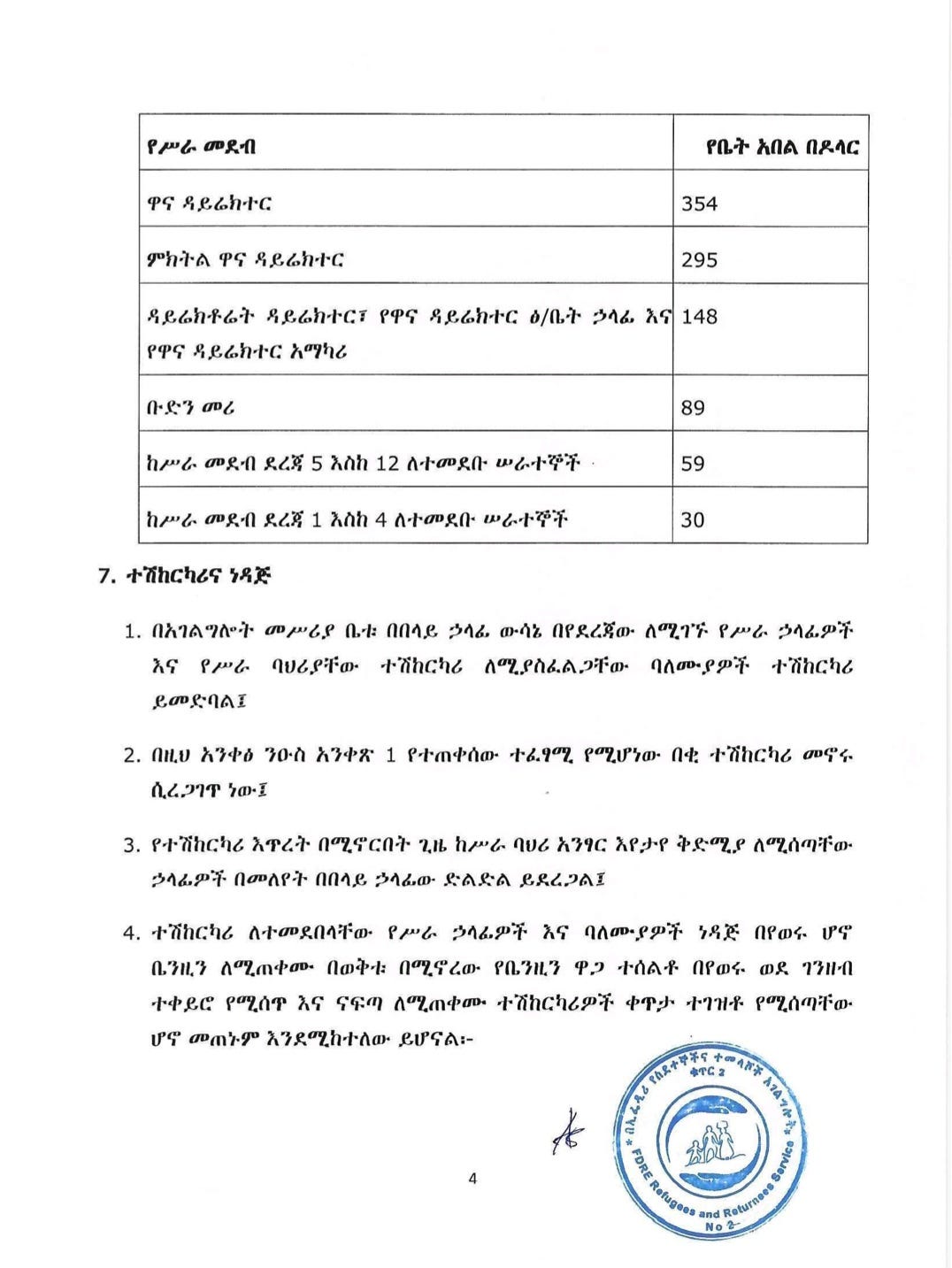 • በአንቀጽ 6 'የቤት ኪራይ አበል' ለዋና ዳይሬክተር 354 ዶላር ለሶስት ምክትሎች ለእያንዳንዳቸዉ 295 ዶላር ይላል ይህም በአሁኑ ምንዛሬ ሲመነዘር ለዋና ዳይሬክተር 354 X 134 ብር = 53,100ብር ሲሆን ለሶስት ምክትሎች ለእያንዳንዳቸዉ 295 X 150 ብር = 44,250 ብር ይሆናል፡፡ ለእነዚህ ተሿሚዎች እንደማንኛዉም ተሿሚ መንግስት የመኖሪያ ቤት እያቀረበ የሚገኝ ሲሆን ለምሳሌ በአሁኑ ወቅት በተቋሙ የአስተዳደር ዘርፍ ምክትል ዋና ዳይሬክተር የሆኑት አቶ ያዕቆብ ያላ ከላይ የተጠቀሰዉን 44,250 ብር የቤት አበል እየተከፈላቸዉ በአዲስ አበባ ከተማ ሳርቤት ገብርኤል ተብሎ በሚጠራ አካባቢ ሰፊ ግቢ ያለዉ የመኖሪያ ቤት ከመንግስት ተሰጥቷቸዉ እንደሚኖሩ ለማወቅ ተችሏል።