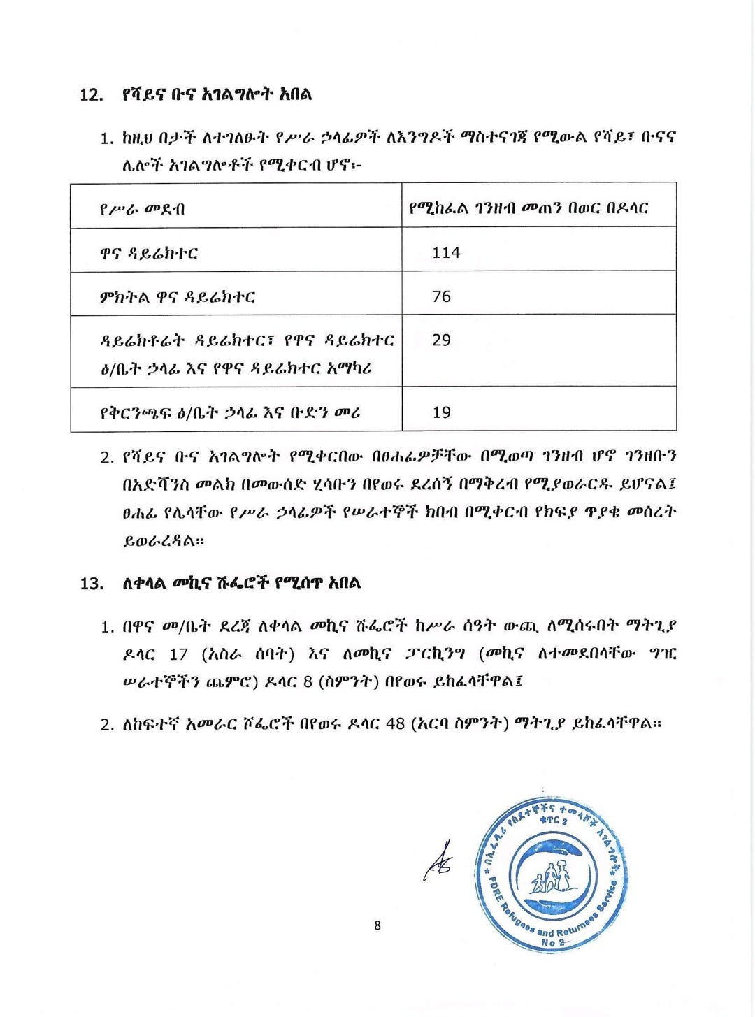 • ሌላዉ በአንቀጽ 12 'የሻይ ቡና አገልግሎት አበል' በሚል የተያዘዉ ለዋና ዳይሬክተር በየወሩ 114 ዶላር፣ ለምክትል ዋና ዳይሬክተሮች ለእያንዳንዳቸዉ 76 ዶላር ይላል፤ ይህም በአሁኑ ምንዛሬ ሲመነዘር ለዋና ዳይሬክተር 114 X 150 ብር = 17,100 ብር ሲሆን ለሶስት ምክትሎች ለእያንዳንዳቸዉ 76 X 150 ብር = 11,400 ብር ይሆናል።