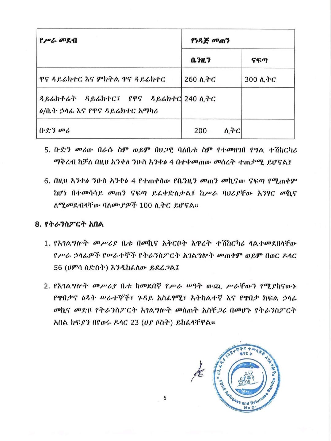• በአንቀጽ 7 'ለተሽከርካሪ ነዳጅ' በሚለዉ ስር ለዋና ዳይሬክተርና ለሶስት ምክትሎች ለእያንዳቸዉ 260 ሊትር ቤንዚንና 300 ሊትር ናፍጣ በየወሩ ለእያንዳንዳቸዉ የሚሰጣቸዉ ሲሆን ይህ ነዳጅ ለአዲስ አበባ ከተማ ላይ ብቻ ለመንቀሳስ ነው። በጠቅላላ 560 ሊትር የነዳጅ ገንዘብ በወቅቱ የነዳጅ ዋጋ ተባዝቶ በየወሩ ይወስዳሉ፤ አሁን ባለዉ አንድ ሊትር በ120 ብር ቢሰላ ለእያንዳንዳቸዉ 67,200 ብር በየወሩ ከደምወዛቸዉ ጋር ይወስዳሉ ማለት ነዉ። ይሁንና በአዲስ አበባ ከተማ ከመኖሪያ ቤት ወደ ሥራና ከሥራ ቦታ ወደ መኖሪያ ቤት ለመሄድ ለሁለት ተሽከርካሪ 560 ሊትር ነዳጅ በአንድ ወር ዉስጥ ይጨርሳል ወይ? የሌሎች ተቋማት አሠራራርስ ? የሚለው ጥያቄ መሆኑን ብዙዎች ይስማማሉ።