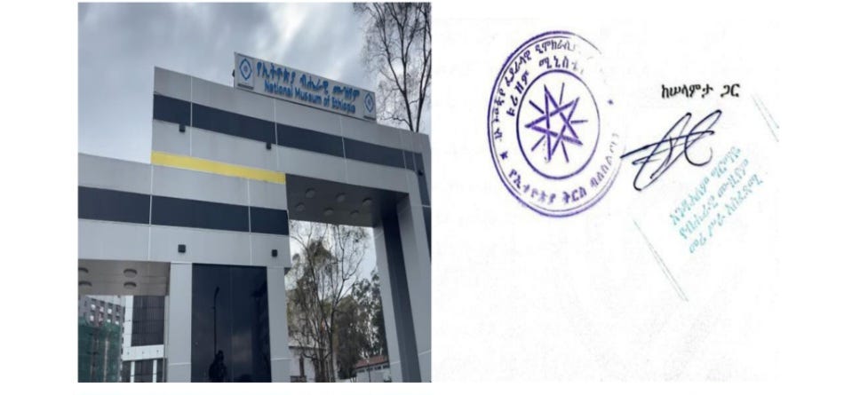 በመሆኑም ለባህልና ታሪክ ጥበቃ፣ ለአለም አቀፍ ትብብር እንዲሁም ለሙያ እድገትና ልማት የሙዚየሞች አስተዳደርና አደረጃጀት የጎላ ሚና ስለሚጫወት ጉዳዩን ለሚመለከተው የመንግስት አካል እና እንዲሁም ሕዝብ እንዲያውቀው ፍተሻ እንድታደርጉ መልዕክት እያስተላለፍኩ በህግ እውቅና ያልሰጠውን ተቋም ባለስልጣኑ ሕዝብንና መንግሰትን በታፔላ ያታለለበትን ምስል እንደሚከተለው አያይዤ አቅርቢያለሁ፡፡