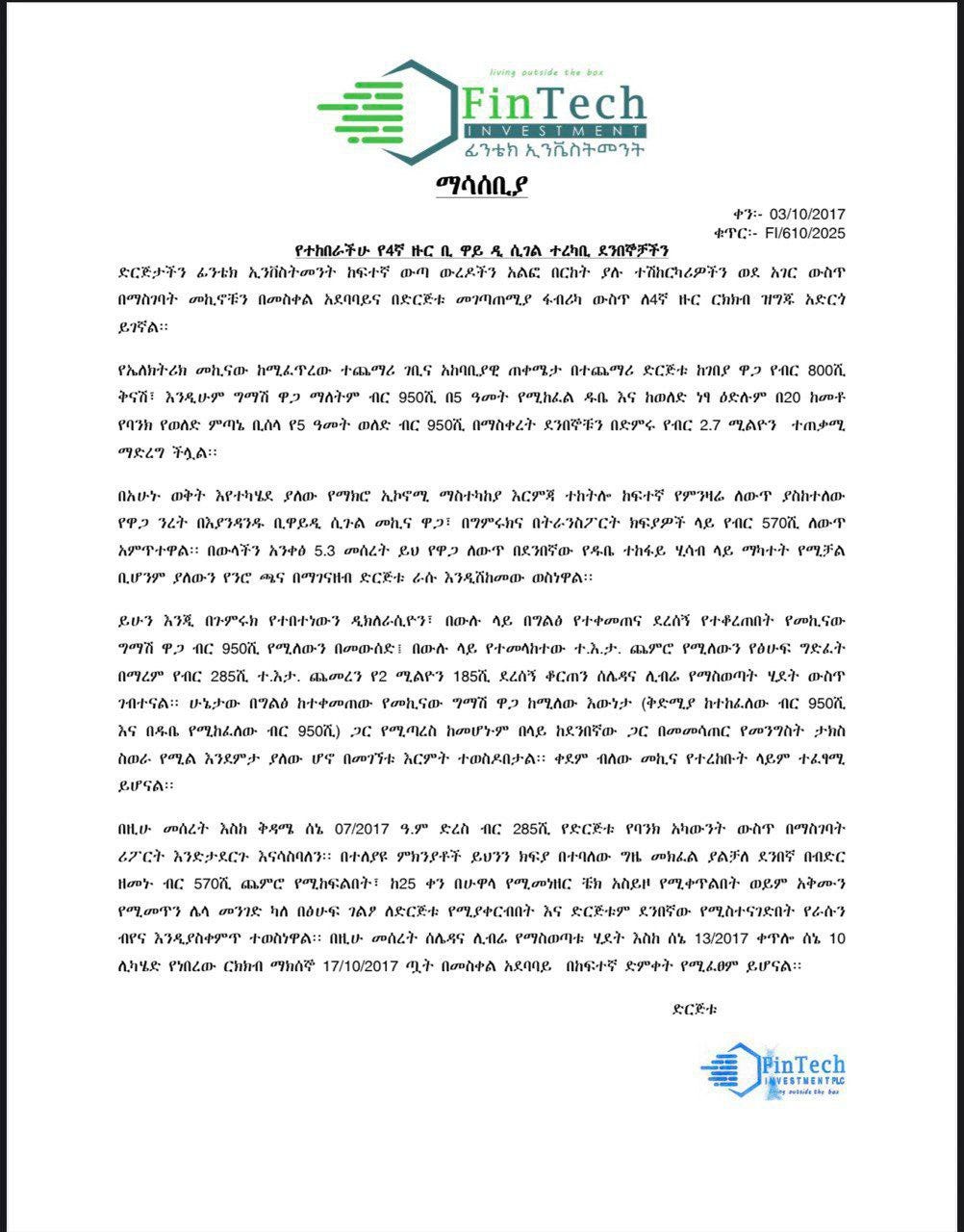 'ፊንቴክ ኢንቨስትመንት' ከመኪና ገዢ ደንበኞቹ በርካታ የተታለናል አቤቱታ ቀረበበት