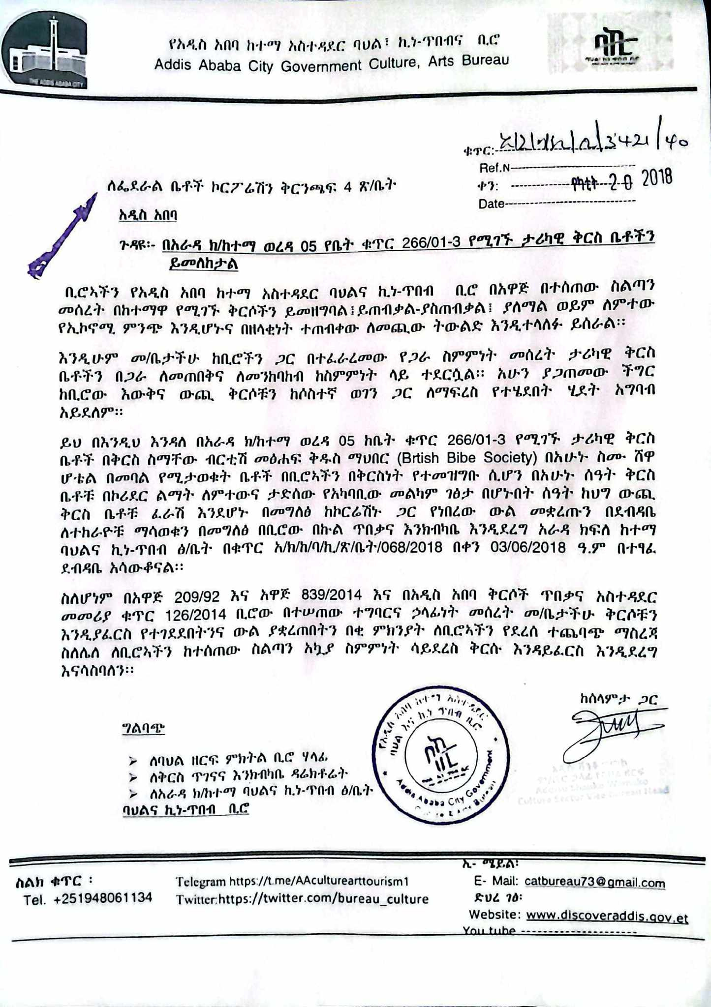 "ብሪቲሽ መፅሐፍ ቅዱስ ማህበር በመባል የሚታወቁት ቤቶች በቢሯችን በቅርስነት የተመዘገቡ ሲሆን በአሁኑ ሰዓት ቅርስ ቤቶቹ በኮሪደር ልማት ለምተው እና ታድሰው የአካባቢው መልካም ገፅታ በሆኑበት ሰዓት ከህግ ውጪ ለተከራዮቹ ማሳወቁን የአራዳ ክፍለ ከተማ ባህል እና ኪነጥበብ ፅ/ቤት አሳውቆናል" የሚለው ሚድያችን የተመለከተው ይህ ደብዳቤ ነው።