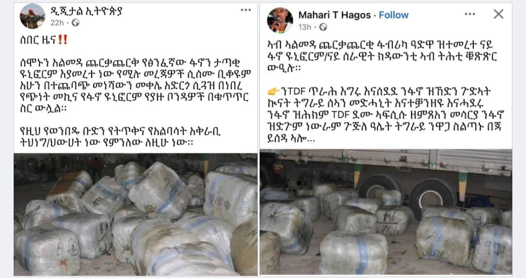 "እነዚህ ማህበራዊ ትስስር ገጾች እና አካውንቶች በርከት ያሉ ቦንዳ ጥቅሎች እና የዕቃ ጭነት ተሽከርካሪ ከፊል አካልን የያዙ ምስሎችንም አጋርተዋል" ያለው ኢትዮጵያ ቼክ የተባለው የመረጃ ማጣርያ ተቋም በተጨማሪም በቁጥጥር ስር የዋለዉ ዩኒፎርም ትግራይ ክልል ውስጥ በአልመዳ ጨርቃጨርቅ የተመረተ እንደሆነ እነዚህ ማህበራዊ ትስስር ገጾች ጠቅሰዋል ብሏል።
